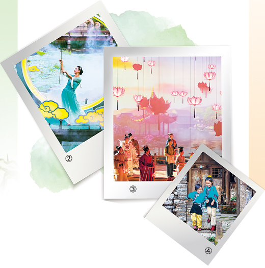 图②:在广西南宁青秀山风景区,舞蹈演员在荷塘畔翩翩起舞。刘 峥摄(影像中国) 图③:以江南文化为特色的多维空间剧《只此周庄》在江苏苏州周庄古镇上演。泱 波摄(影像中国) 图④:贵州安顺平坝区天龙屯堡景区,身穿传统服饰的当地儿童在民居前嬉戏。于永乐摄(影像中国)